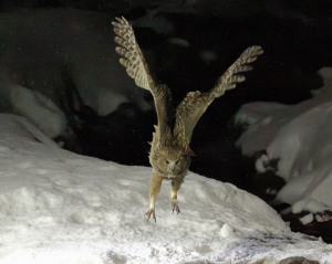その宿とは別のホテルでチェックインを済ませてから、暗くなってから人の姿を見せないように16時頃に観察小屋替わりのバスの廃車体に入り、シマフクロウが来るのを待った。しかし数時間経っても現れない。シマフクロウの声がしたのは日が変わってからで、餌場の近くの木に飛来したのは3時半頃だった。そして、餌の魚を捕まえて飛び去るのを2回見せてくれた。一度目は魚を咥えたまま飛び去り、二度目は飲み込んでから飛び立って一旦沢に降りてから飛び去った。