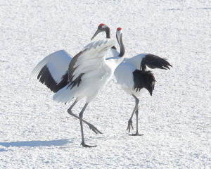 朝、鶴居村に着くと、雪原の上に何羽ものタンチョウがいて、鳴き合いや求愛ダンスをするペアがいく組かいた。背景が雪以外だと、鳴き合いで吐かれた息が白く見える。もっと早い時間だったら朝日で赤くなっていただろう。やがて、ねぐらからたくさんのタンチョウが飛んできた。